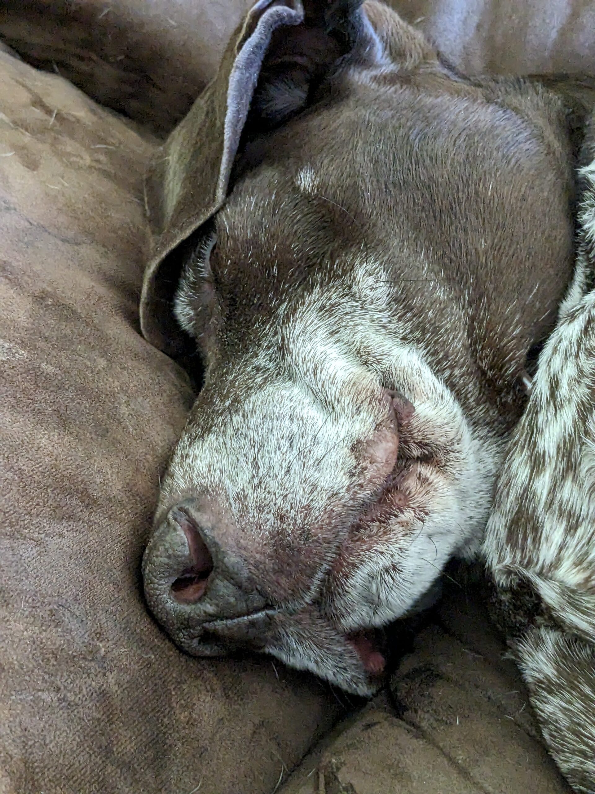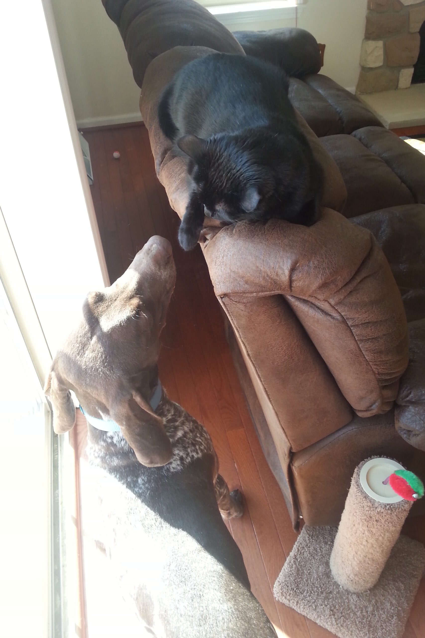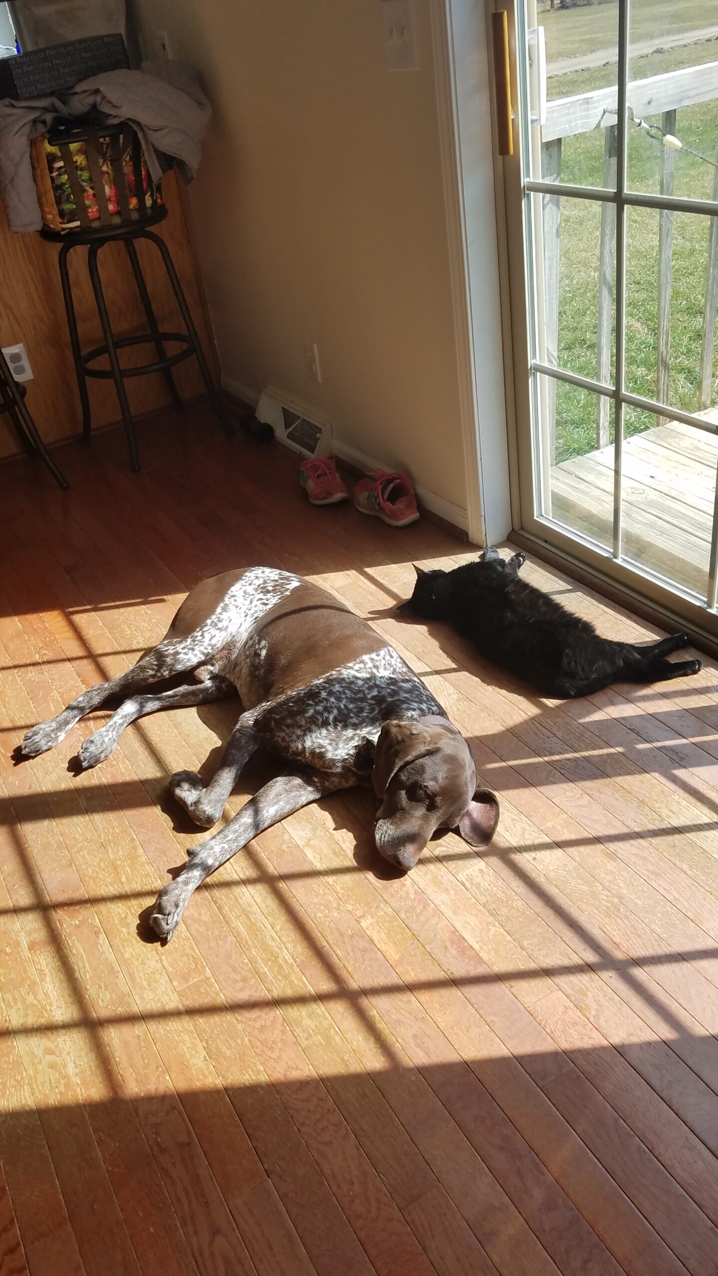 Lo and behold, he had a 1 year old who flunked out of hunting (and common sense) and so Buddy came home. With time everyone realized that he was mentally disabled, but that didn’t take away from who he was. He loved his balls and gnawing heavily on toys, and food and sun bathing were the loves of his life! He got along great with our black cat, Mina, but mostly because he was so unaware that he usually didn’t even notice her (she didn’t like him, but mostly because he was libel to step on her).